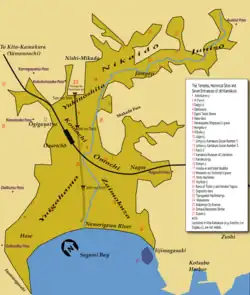 In administrative terms, the municipality of Kamakura borders with Yokohama to the north, with Zushi to the east, and with Fujisawa to the west.[2] It includes many areas outside the Seven Entrances as Yamanouchi, Koshigoe (腰越), Shichirigahama, and Ofuna, and is the result of the fusion of Kamakura proper with the cities of Koshigoe, absorbed in 1939, Ofuna, absorbed in 1948, and with the village of Fukasawa, absorbed in 1948.