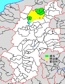 * yellow - areas formerly within the district borders during the early Meiji period