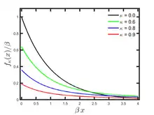 The Kaniadakis exponential distribution (or κ-exponential distribution) is a probability distribution arising from the maximization of the Kaniadakis entropy under appropriate constraints. It is one example of a Kaniadakis distribution. The κ-exponential is a generalization of the exponential distribution in the same way that Kaniadakis entropy is a generalization of standard Boltzmann–Gibbs entropy or Shannon entropy.[1] The κ-exponential distribution of Type I is a particular case of the κ-Gamma distribution, whilst the κ-exponential distribution of Type II is a particular case of the κ-Weibull distribution.