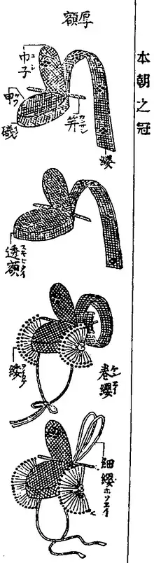 A kanmuri (冠) is a type of Japanese cap generally consisting of lacquer-coated black silk gauze, with ornaments including a pennon. It was the standard headwear worn by adult men at the Japanese imperial court, including courtiers, aristocrats, and the emperor, from the Heian period to the Meiji Restoration. Today, it is worn only by the Imperial Family and government officials on rare occasions, such as weddings and the accession of new emperors. It is worn in conjunction with the sokutai.[1]