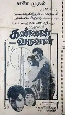 Kannan Varuvan (transl. Kannan will come)[1] is a 1970 Indian Tamil-language film directed by I. N. Murthy and written by A. L. Narayanan from a story by A. Gurusami.[2][3] The film stars Jaishankar, Muthuraman, Lakshmi, Nirmala and Vijaya Lalitha. It was released on 2 October 1970.