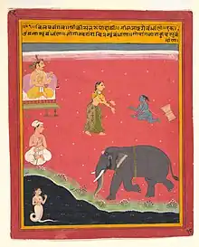 Painting of Krishna tied to a mortar. Page from a Bilvamangalastava, Metropolitan Museum of Art.