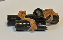 In addition to being the focus of many dishes, kanpyō strips are frequently used as an edible twist tie in dishes such as fukusa-zushi and chakin-zushi.[1] Typically the dried strips are boiled to soften, and then boiled a second time with soy sauce, sugar, and other ingredients added for flavor.[1][7]