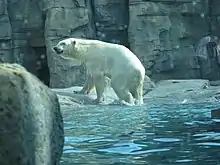 This exhibit opened on August 8, 2010, with the introduction of a polar bear named Nikita,[6] who was given to the Kansas City Zoo by the Toledo Zoo. The $10 million exhibit features a 140,000 US gallons (530,000 L) pool serviced by a massive waterfall, multiple indoor and outdoor viewing angles with 2.25-inch-thick (57 mm) glass windows, and space for up to two additional polar bears.[7] In early-2013, a second polar bear was added to the exhibit, a female named Berlin, who was loaned to the zoo from Duluth, Minnesota's Lake Superior Zoo in hopes that the two bears would breed.[8] In late-2015, Nikita was transferred from the zoo to the North Carolina Zoo for breeding purposes.[9] In late-2020, the zoo welcomed a new male polar bear named Nuniq, previously born at Ohio's Columbus Zoo and Aquarium in 2016 and living at the Henry Vilas Zoo in Madison, Wisconsin before transferal.[10]