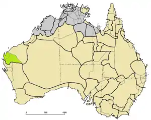 Kanyara–Mantharta languages (green) among other Pama–Nyungan (tan). Kanyara is the group on the coast, Mantharta inland.