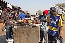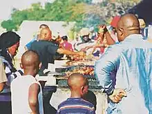 Kapana is a way of preparing raw meat, typically beef, in Namibia by grilling it on an open fire.[1] The grilled meat is often sold at stalls in open markets; it is cut into small pieces and grilled and sold while it is cooking.[2] People from all walks of life come and enjoy the meat. There are often many people selling it at one place, so the price is always negotiable. Kapana business has contributed in a small way to the economic development of the country[3] by giving unemployed young people an opportunity to start their business with a very low capital and look after their family.[4] The township of Katutura in Windhoek is known for its kapana.[5]