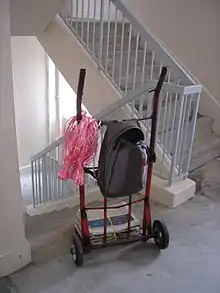 A traditional karang guni cart at a staircase landing