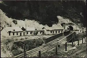 A key feature of the railway was the Karawanks Tunnel. Its construction was particularly challenging due to the local geology being particularly unstable. Boring was accomplished by teams working at either end of the alignment, as many as 6,000 men worked in the tunnel's vicinity at the peak of activity. Electricity generated by waterfalls near to the future tunnel portals were used to power various items of equipment, from lighting to ventilation fans. Progress was made at an average rate of 13 feet per day, although complications would occasionally cause less progress to be made.[2] In comparison to contemporary tunnels, the total cost of its construction was notably higher.[3]