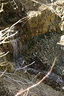 The outcrop at the falls is a stratotype of the Saka Member of the Toila Formation.[4] The upper 6 meters (20 ft) are made of limestone (Loobu Formation and Aseri Formation). Below it is a 15-centimeter (5.9 in) layer of clayey ooid-containing limestone of the Silaoru Formation. Below it is a 130-centimeter (51 in) layer of glauconite-containing limestone of the Kalvi and Künnapõhja Members, and the lower part of the outcrop consists of thick-layered yellow dolomitized limestone of the Saka Member.[5]