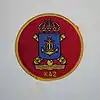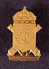 The coat of arms of the Karlskrona Coastal Artillery Regiment (KA 2) was established in 1967.[6] Blazon: "Azure, The monogram of King Charles XI surmounted an erect anchor. The shield surmounted two gunbarrels of older pattern in saltire above a flaming grenade and waves, all or."[7]