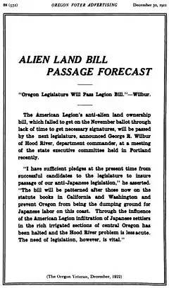 Aim was also taken at Japanese immigrants with the Alien Property Act of 1923, which prohibited Japanese-born citizens from purchasing or leasing land in the state of Oregon.[20]