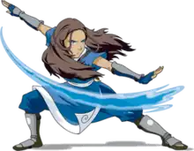 Katara is highly skilled in waterbending, which utilizes Chinese martial arts techniques of "internal style" tai chi and Jeet Kune Do; Katara is the only surviving master of "Southern style waterbending" after the 100-year war.[27][28][29][30] The series' creators consulted a professional martial artist in the design of the show's fighting style.[31] Waterbending represents the element of change – a shapeshifter constantly changing forms[32] – and is categorized as the most adaptive or pliable of the "four bending arts". Waterbending emphasizes "softness and breathing" over "hard aggression"; fluid and graceful, acting in concert with the environment; and creating opportunities where none exist. This "flow of energy" allows their defensive maneuvers to translate into focus on control and counter-offenses, turning their opponents' momentum against them. Despite these advantages, waterbending is almost entirely dependent on inertia; it is essential for practitioners to not be rigid, but to be fluid and able to adapt to any situation.