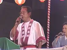 Bon odori singer: the characters on his happi coat read Gōshū Ondo and Kawachi Ondo.