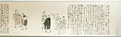 After his journey, he spent five years working and reworking the poems and prose of Oku no Hosomichi before publishing it.[8] Based on differences between draft versions of the account, Sora's diary, and the final version, it is clear that Bashō took a number of artistic liberties in the writing.[13] An example of this is that in the Senjūshu ("Selection of Tales") attributed to Saigyō, the narrator is passing through Eguchi when he is driven by a storm to seek shelter in the nearby cottage of a prostitute; this leads to an exchange of poems, after which he spends the night there. Bashō similarly includes in Oku no Hosomichi a tale of him having an exchange with prostitutes staying in the same inn, but Sora mentions nothing.[14]