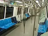 A mock-up was manufactured in Japan after Kawasaki won the contract.[23] It was shipped to Singapore and put on public display during the 1984 National Exhibition held in November 1984 at World Trade Centre.[23] The mock-up featured three choices of seating arrangements and colour schemes; members of the public were invited to give feedback on these options.[23] The finalised interior design of the C151 trains consisted of a fully longitudinal seating arrangement.[24] The bucket seats were made of plastic; glass partitions separated the seating areas from the passenger doors.[24] Strap lines for standing passengers were installed in the middle of every car.[24] The colour scheme of each adjacent car's interior is distinct to make car identification in cases of fault reporting easier for passengers.[24] Originally the colour scheme of the driving trailer cars was orange, that of the second and fifth motor cars was blue, and that of the two centre motor cars was green.[2] There were nine seats between two doors; this was reduced to seven after the first round of refurbishment.[24]