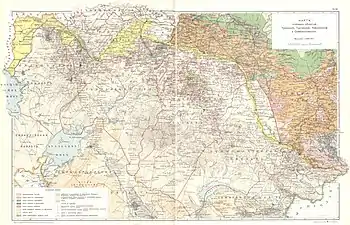 NTD of the area along ethnic lines had been proposed as early as 1920.[8][9] In Tsarist times the general area of modern Kazakhstan was composed of four regions (oblasts); west-to-east these were Ural (plus part of Transcaspian Oblast, Turgai, Akmolinsk and Semipalatinsk. All four oblasts had been created by a Decree of Tsar Alexander II of October 21 (November 2) 1868.[10] On 26 August 1920 the Kirghiz Autonomous Socialist Soviet Republic (KASSR, located within the Russian Soviet Federative Socialist Republic, RSFSR) was created from these four provinces (briefly joined together in this period in the short-lived Alash Autonomy), with the northern border of the ASSR essentially following that of the former four oblasts, though adjusted in places to reflect local demographics, however disputes over specific areas of the boundary continued into the following year.[11] Note that at this time Kazakhs were referred to as ‘Kyrgyz’ and what are now the Kyrgyz were deemed a sub-group of the Kazakhs and referred to as ‘Kara-Kyrgyz’ i.e. mountain-dwelling ‘black-Kyrgyz’).[12][13] The areas west of the Ural river associated with the Kazakh Bukey Horde were claimed by both the KASSR and Astrakhan Oblast, with most of the area going to the KASSR in 1921, including Kurmangazy and Sinemorsk.[14] Elsewhere, some Russian-inhabited areas of the four oblasts, such as Omsk, were transferred to Russia.[15][16][14]