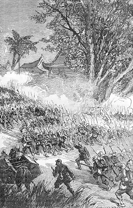On the morning of 7 March the French thrust westwards from Yueh-mei-shan and fought their way to the summit of Hung-tan-shan, where they stormed Fort Bamboo. The attackers were aided by a diversionary attack mounted by Cramoisy's marine infantry company from the Keelung garrison, which had stealthily occupied a hill position to the west of Fort Bamboo during the previous night. Cramoisy's marsouins disclosed themselves as Fontebride's zéphyrs approached Fort Bamboo from the east, disorganising the Chinese defenders with a devastating volley from behind their positions. The hoisting of the French tricolour above Fort Bamboo was greeted by the ships of the Far East squadron lying in Keelung harbour with blasts on their foghorns, and by cheers from the French troops echeloned back along the line of advance on the summits of Yueh-mei-shan and Liu-k'eng-shan.[38]