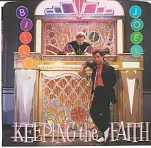 "Keeping the Faith" is a song by rock singer-songwriter Billy Joel, from his 1983 album An Innocent Man, serving as its closing track and the final single released from the album. The cover for the single shows an image of Joel and the judge (character actor Richard Shull) in the "jukebox" courtroom from the video.