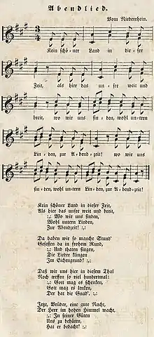 In 1840, Anton Wilhelm von Zuccalmaglio published in the second volume of a collection of Volkslieder which was begun by Andreas Kretzschmer,[1] entitled Deutsche Volkslieder mit ihren Original-Weisen (German folk songs with their original tunes),[2] 382 songs which he collected himself, according to his preface. Some of the songs, however, were written and composed by Zuccalmaglio in the sense of a romantic Volkslied concept ("im Sinne eines romantischen Volksliedkonzeptes").[3] These include "Kein schöner Land in dieser Zeit", which he published under the title Abendlied (Evening Song) on page 494 as No. 274. It is marked as "Vom Niederrhein" (from Lower Rhenania),[4] probably invented by the author.[3]