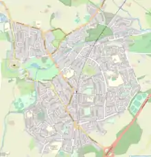 Kenilworth (/ˈkɛnɪlwərθ/ KEN-il-wərth) is a market town and civil parish in the Warwick District in Warwickshire, England, 6 miles (10 km) south-west of Coventry, 5 miles (8 km) north of Warwick and 90 miles (140 km) north-west of London. It lies on Finham Brook, a tributary of the River Sowe, which joins the River Avon 2 miles (3 km) north-east of the town. At the 2021 Census, the population was 22,538.[1] The town is home to the ruins of Kenilworth Castle and Kenilworth Abbey.