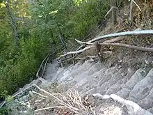 Uli's Stairs are stone steps that connect the mountain brow to the Rail Trail. They were made by a local man named Ulrich, otherwise known as Uli. The city sees his steps as a risk to public safety. The city has a set of steps made of steel nearby at the end of Kimberly Drive near Kenilworth Avenue that go from the lower city to the Escarpment Rail Trail and the Bruce Trail, and another set of stairs a few hundred feet east of those connecting the Rail Trail and the Mountain Brow at Margate Avenue.