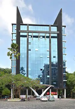 The foundation stone for the new multi-storied building now housing the High Court of Kerala was laid on 14 March 1994 by the then Chief Justice of India, Justice M. N. Venkatachaliah. The estimated cost of construction was 100 million Indian rupees.[2] The construction was completed in 2005 at a cost of 850 million Indian rupees. The completed High Court building was inaugurated by the Chief Justice of India, Justice Y. K. Sabharwal on 11 February 2006. The new High Court building is equipped with modern amenities like videoconferencing, air conditioned courtrooms, internet, and facilities for retrieval of order copies and publishing of the case status via the internet. The building is built on 5 acres (20,000 m2) of land and has a built-up area of 550,000 square feet (51,000 m2) over nine floors. The building has in it a post office, bank, medical clinic, library, canteens and such other most needed utilities and services. The High Court of Kerala has moved to its new building from the date of its inauguration, from the adjacent palace, where it had been functioning.