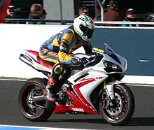 In 1987, he got his break in the 500cc world championship with three wildcard appearance on the Kenny Roberts Yamaha team. Crashing in the opening Japanese Grand Prix, he earned a point in the rain-affected Dutch TT before scoring an impressive third place in his third ever Grand Prix at the Portuguese Grand Prix round. Having teamed up with Martin Wimmer to win the 1987 Suzuka 8 Hours endurance race, and having also won the 1987 round of the now-defunct Formula 1 motorcycle championship at Sugo, he became the only rider to stand on the podium of three different World Championships in a calendar year.[2][3]
