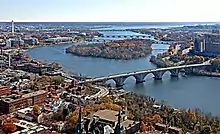 In March 1914, Representative Charles Creighton Carlin of Virginia sponsored legislation to replace Aqueduct Bridge with a new, $1 million structure.[12] The Commissioners of the District of Columbia (the city's appointed government) approved the new bridge in June.[13] Controversy over the new bridge immediately broke out. Senator Claude A. Swanson, chairman of the Senate Committee on Public Works, wanted the new bridge built about 3,000 feet (910 m) downstream at the mouth of Rock Creek (at about 30th Street NW), where it would cross Analostan Island and the Potomac River to Rosslyn.[14] Georgetown merchants strongly opposed this plan.[15] Some in Congress wanted to repair the existing bridge, but a study by the United States Army Corps of Engineers in August 1914 showed that the existing structure was inadequate for the amount of traffic and too unstable to be saved.[11] Secretary of War Lindley Miller Garrison, who oversaw the Corps, agreed that a new bridge was necessary in December.[16] Rep. William C. Adamson, chairman of the House Committee on Public Works, challenged Swanson and declared that the new bridge should be placed where the old one was.[17]