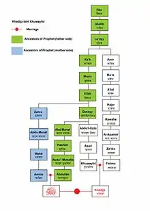 Khadija's mother, Fatima bint Za'idah, who died in 575,[4] was a member of the Amir ibn Luayy clan of the Quraysh[5] and a third cousin of Muhammad's mother.[6][7]