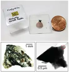 Khatyrkite (/ˈkætiərkt/ KAT-ee-ər-kyte)[5] is a rare mineral which is mostly composed of copper and aluminium, but may contain up to about 15% of zinc or iron.[4][6] Its chemical structure is described by an approximate formula (Cu,Zn)Al2 or (Cu,Fe)Al2. It was discovered in 1985 in a placer in association with another rare mineral cupalite ((Cu,Zn,Fe)Al). These two minerals have only been found at 62°39′11″N 174°30′02″E / 62.65306°N 174.50056°E / 62.65306; 174.50056 in the area of the Iomrautvaam, a tributary of the Khatyrka river, in the Koryak Mountains, in Anadyrsky District (former Beringovsky District), Chukotka, Russia. Analysis of one of the samples containing khatyrkite showed that the small rock was from a meteorite.[7] A geological expedition has identified the exact place of the original discovery and found more specimens of the Khatyrka meteorite.[8][9] The mineral's name derives from the Khatyrka (Russian: Хатырка) zone where it was discovered.[10] Its type specimen (defining sample) is preserved in the Mining Museum in Saint Petersburg, and parts of it can be found in other museums, such as Museo di Storia Naturale di Firenze.[2][3][6]