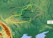 Boxed in, the Magyars were forced to migrate further west across the Carpathian Mountains into the Hungarian plain, depriving the Khazars of an important ally and a buffer from the Rus'.[97][98] The migration of the Magyars allowed Rus' access to the Black Sea,[99] and they soon launched excursions into Khazar territory along the sea coast, up the Don river, and into the lower Volga region. The Rus' were raiding and plundering into the Caspian Sea region from 864,[lower-alpha 7] with the first large-scale expedition in 913, when they extensively raided Baku, Gilan, Mazandaran and penetrated into the Caucasus.[lower-alpha 8][101][102][103]