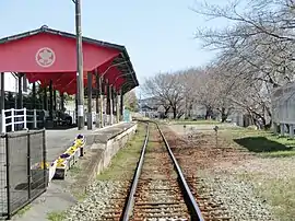 The station has a single island platform with only one of its two tracks in operation. The adjacent single-story wooden station building, connected by a level crossing, also contains a ramen noodle restaurant. The station building, goods shed , platform and viaduct are protected as Registered Tangible Cultural Properties of Japan since 2011.[1][2][3]