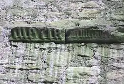 Set within the main fireplace of the keep are two red sandstone carved pieces with Gothic script. One reads 'Maria' and the other with smaller script has not been deciphered. Sandstone pillars on either side of this fireplace carry carvings of climbing plants that may be ivy. One suggestion regarding the Gothic script carvings in the fireplace is that they could be the names of saints and that this was a religious 'Apotropaic' protective device to prevent the ingress of evil spirits into the house through an otherwise 'unprotected' entry point.