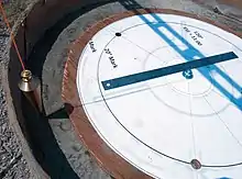 Because the location is subject to significant frost heaving, 6000 pounds of concrete were poured to a depth of 6' deep to form a foundation and 36" diameter solid concrete pier. Once the concrete had set, it was time to worry about preparation for the alignment of the cast steel pier. Meade provides the cast steel pier mount with approximately 5 degrees of play so a very accurate alignment onto the concrete base would be required to ensure that the necessary tolerances would accommodate the play provided. Using a compass is tricky and often inaccurate due to the rebar within the concrete pier interfering with the compass' magnetic reading. So another solution was required.