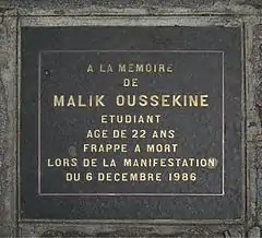 - ↑ "Hommage à Malik Oussekine : 30 ans après, Sarah, sa sœur, est toujours "partagée entre colère et tristesse"". TF1 INFO (in French). 6 December 2016. Retrieved 14 May 2022.