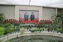 Kimilsungia and Kimjongilia Exhibition Hall. The namesake flowers are to the middle and side respectively, nearest the portrait of the Juche leaders.