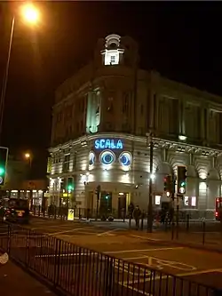 Intended to be an alternative National Film Theatre, the Scala Film Club (which took its name from Scala House, its home on Tottenham Street) moved to this venue in 1981 under the management of Stephen Woolley.[3] However, when the Scala showed the film A Clockwork Orange, then withdrawn from UK distribution, the copyright holder Warner Bros. sued at Kubrick's insistence, and won.[4] As a result, Scala was almost rendered bankrupt and closed in 1993; however, the club was re-opened in 1999. The cinema had been refitted, with the lower seating area incorporating the new stage, DJ booth and dancefloor, while the upper seating area incorporated a second room and a DJ booth.