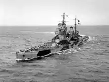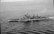 King George V was the first ship of the class to join the Home Fleet on 11 December 1940 and her first action was providing distant cover for Operation Claymore in February 1941, before escorting Atlantic convoys HX 114 and HX 115 during March.[118] Owing to the threat of the German battleship Bismarck, the Home Fleet sent King George V and the newly completed Prince of Wales on 22 May to help locate Bismarck, along with the battlecruiser HMS Hood and six destroyers.[119] On 24 May, Prince of Wales and Hood made contact with Bismarck and opened fire at 26,000 yards.[120] Prince of Wales' sixth salvo straddled Bismarck and it was during this salvo, and one other, that she landed two decisive hits, holing Bismarck's bow, flooding a generator room and an auxiliary boiler room, and forcing the critical shutdown of two of her boilers, which led to Bismarck making the fateful decision to attempt to return to port.[121] During this time Bismarck and Prinz Eugen had been solely targeting Hood and at 06:01 Hood blew up and sank, with the loss of all but three of her complement of 1,419 officers and men.[122] Following this, Captain Leach (Prince of Wales′ captain) gave the order to disengage, laying a heavy smokescreen to facilitate the retreat. Prince of Wales would attempt to reengage Bismarck on two more occasions, but owing to the distance being in excess of 20,000 yards was unable to land any more hits and then was forced to return to Iceland to refuel and would play no further part in actions against Bismarck.[123] Meanwhile, King George V on 24 May was still 300 to 400 miles away from Bismarck and it was not until 27 May that King George V and HMS Rodney were able to engage Bismarck, due to a Swordfish torpedo bomber disabling Bismarck's steering gear on 26 May.[124] During the engagement King George V and Rodney were able to relatively quickly disable the main armament turrets and fire-control systems of Bismarck, rendering her unable to effectively engage the British ships; later they closed to point-blank range. After 32 minutes of firing King George V had fired 335 14-inch shells at Bismarck, scoring multiple hits that contributed to Bismarck sinking soon after.[125][126]