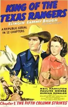 King of the Texas Rangers (1941) is a Republic film serial.[2] Set in the years prior to America entering World War II, the plot is slightly anachronistic in that the serial features a mix of period western and modern elements, which was not unknown in the B-Western films also produced by Republic.[3] Although the serial's plot involves cowboys battling Axis agents in Texas. Nazis are never named as such but their presence is strongly implied within the serial.[4][lower-alpha 1]