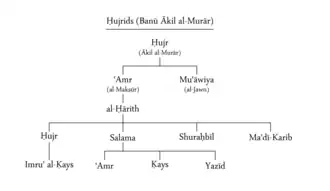 Hujr became the founder of the Kinda's royal household, the Banu Akil al-Murar, so-called after Hujr's nickname Akil al-Murar (lit. 'the one who eats bitter herbs').[6][7] In an inscription in South Arabian script, he styled himself "king of Kinda".[2] While the house of Akil al-Murar stemmed from the Banu Mu'awiya, one of the three main divisions of the Kinda, most of the tribesmen who accompanied him belonged to the Sakun division.[8]