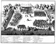 The Whydah army in the 18th century was commanded by the governors of the 26 districts.[8] The governors were expected to arm their men with weapons.[8][9] Assou; Provincial governor and caboceer of the French fort at Whydah, could bring on to field 5–600 men as well as 4 French cannons. Another governor commanded 2,000 men while others could field 100, 200 or more men. Specialists existed in the army such as the Captain of the King's Musketeers. The Whydah army was divided into the left and right wings as well as the center which were further divided into platoons. In war, the first to go into action were the Musketeers who fought in the front ranks of the army. The archers followed suit and the army charged in after. The action culminated into hand to hand combat with swords, axes, and knives. Musketeers were employed around the late 17th century but they did not replace the spearmen, swordsmen and archers.[8]