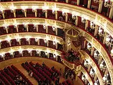 The Teatro Reale di San Carlo in Naples, 1830, as rebuilt after the 1816 fire. It is the oldest continuously active venue for opera in the world.[34][35]