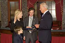 Gillibrand was sworn in on January 26, 2009; at 42, she entered the chamber as the youngest senator in the 111th Congress.[6] In February, she endorsed Scott Murphy, whom New York Democrats chose as their nominee for her former seat in the House of Representatives.[54] In April, Murphy won the seat against Republican Jim Tedisco by 399 votes and succeeded Gillibrand in the House until 2011.[55]
