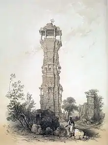 The 22 metres (72 ft) tower was built by a Jain merchant Jeeja Bhagerwala during the reign of Rawal Kumar Singh in c. 1179–1191 CE.[2][3][4][5] It was the residence of Jinavallabha who propagated the Vidhimarga in the 12th century. From the 15th to 17th centuries, it was the seat of a Bhattaraka.[6]