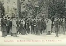 Kitabgi received, with great pomp, Mozaffaredin shah at the Persian pavilion on July 30, 1900.[23] He read a speech in Persian to his sovereign. Three days later, as the Shah was on his way to Sèvres, his carriage was attacked by a terrorist who pointed a revolver at him. The madman was subdued before he could fire. The Shah was late in his visits and Kitabgi was charged with announcing to the organizers of the stands concerned that they would not be visited by the king of kings.[24]