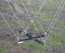 A Picavet suspension, named after its French inventor, Pierre Picavet, consists of a rigid cross suspended below the kite line from two points. A single line is threaded several times between the points of the cross and the points of attachment to the kite line and the rig is attached to the cross. The Picavet line runs through eye hooks or small pulleys so that the weight of the rig causes it to settle naturally into a level position. The dimensions and shape of the Picavet have been adapted many times in attempts to increase stability or to improve portability.