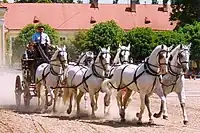 The Kladruber (Czech Starokladrubský kůň) is the oldest Czech horse breed and one of the world's oldest horse breeds. It is considered very rare. The chief breeder and the keeper of the studbook is the National Stud at Kladruby nad Labem in the Czech Republic where Kladrubers have been bred for more than 400 years. Kladrubers have always been bred to be a galakarossier – a heavy type of carriage horse for the court of the House of Habsburg.