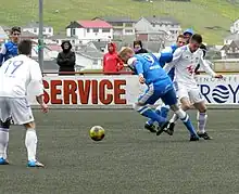 KÍ Klaksvík (in white) v.s FC Suðuroy (in light blue) in Effodeildin on 30 June 2012.