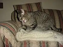 Kneading (also referred to as making biscuits[1]) is a behavior frequently observed in domestic cats where, when a cat feels at ease, it may push out and pull in its front paws against a surface such as furniture or carpet, often alternating between right and left limbs. Each stroke is accompanied by a grasping motion of the claws as if the cat were kneading dough.