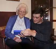 A recipient of an Amazon Kindle Fire Tablet is shown how to use her device. Newry, 2016